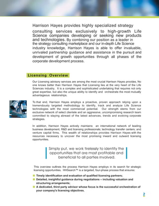 Harrison Hayes offers specialized strategy consulting services for high-growth life science companies focused on licensing opportunities, employing a four-phase process called hhsearchtm to identify and negotiate strategic partnerships. The phases include reviewing strategic objectives, conducting a candidate search, organizing meetings with potential partners, and managing negotiations and closings with a commitment to confidentiality and tailored guidance. Their extensive network and proven methodologies ensure clients navigate the complex landscape of licensing effectively to achieve mutually beneficial outcomes.