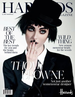 The document introduces a luxury watch made of titanium ceramic, highlighting its unique features such as high scratch resistance, self-winding movement, and water resistance up to 200 meters. It also includes mentions of various fashion and lifestyle products available at Harrods, along with articles on trends, interviews, and seasonal recommendations in fashion, beauty, and food. Additionally, the magazine presents various upscale offerings and events at Harrods during July and August.