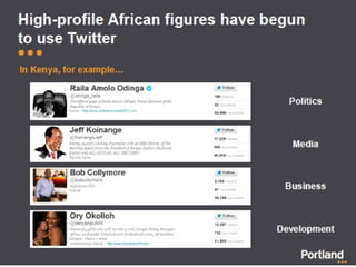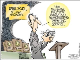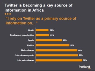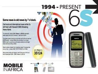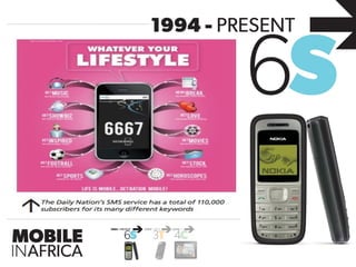 This document discusses how journalists in Africa are responding to the rise of mobile technology. It outlines the evolution of mobile from Mobile 1.0 with small screens and high costs, to Mobile 2.0 with touchscreens and more transparency in pricing, to Mobile 3.0 which is cloud-based and community-driven. The document notes that connectivity in Africa remains poor compared to other regions but that mobile is transforming how journalists work by allowing them to better connect, collaborate, curate content, and attract audiences.