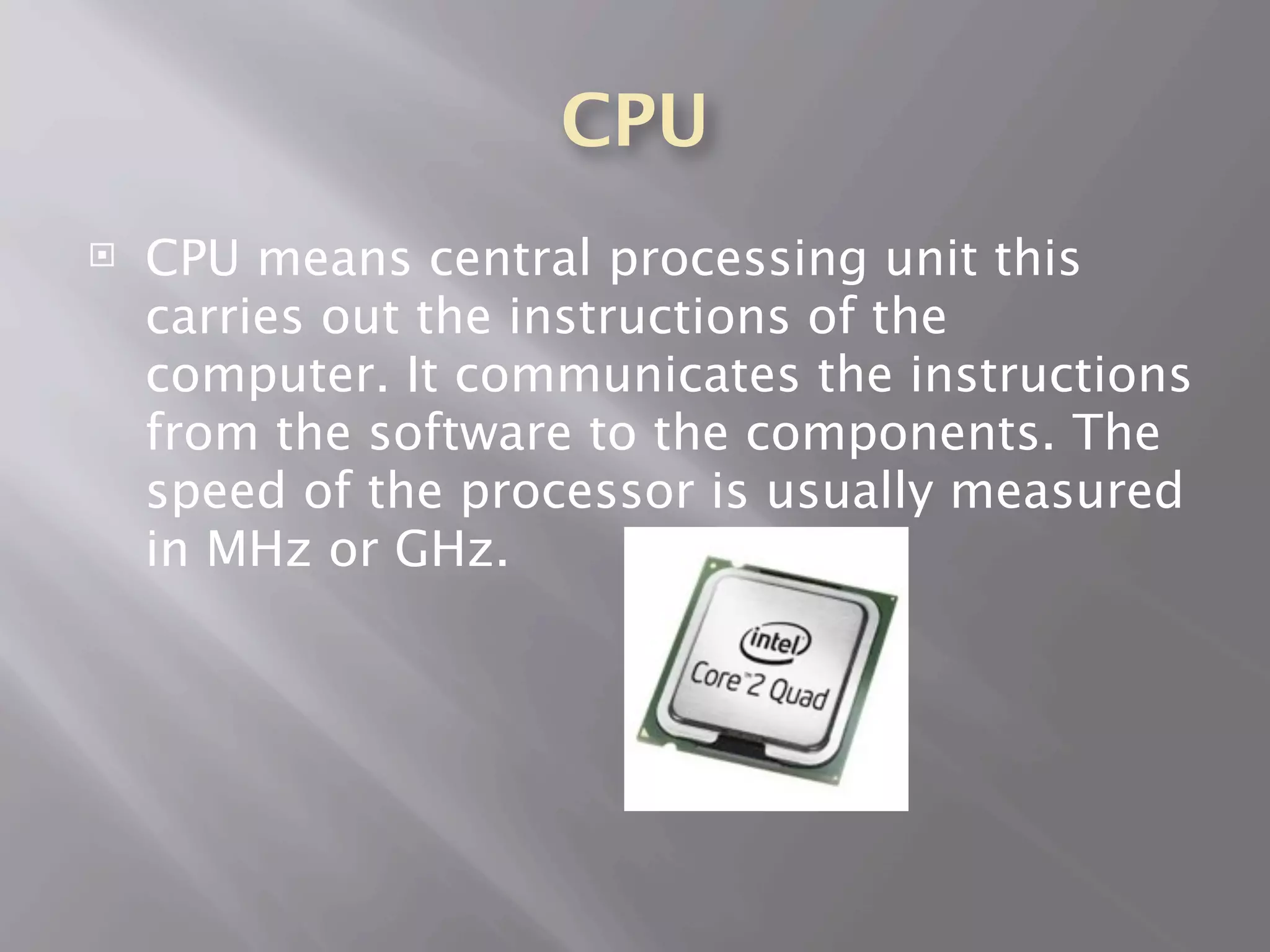 The central processing unit (CPU) carries out the computer's instructions and communicates with other components. A heat sink cools the CPU using thermal compound. There are two main processor manufacturers, AMD and Intel, which make dual and quad-core processors. Memory includes RAM, ROM, cache memory, and solid state drives. Storage devices include hard disk drives, solid state drives, external hard drives, and SCSI devices. Other components are adapter cards, sound/video cards, the motherboard, and the power supply.