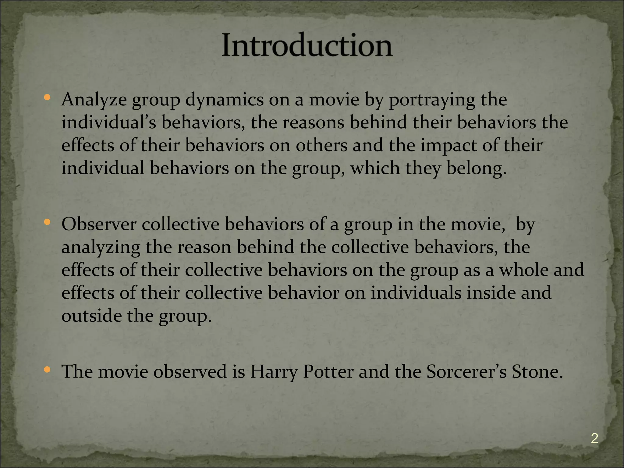 The document analyzes group dynamics in the movie 'Harry Potter and the Sorcerer's Stone', focusing on individual behaviors and their impacts on the group, with key characters like Harry, Hermione, and Ron undertaking a quest to find a missing magical stone. It highlights their decision-making capabilities, leadership roles, and relationships both within their group and with others, showcasing the challenges they face together, including personal conflicts and external threats. Ultimately, the group works effectively despite obstacles, exhibiting teamwork and problem-solving skills in a magical educational environment.