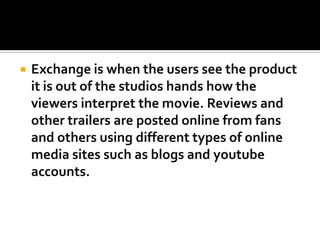 The document discusses how two films, Harry Potter and the Deathly Hallows Part 2 and Attack the Block, used online exchange and social media to promote themselves. It describes how for both films users posted reviews, trailers and discussion online which helped promote the films but also allowed negative comments and reviews outside of studio control. Technology played a key role in allowing this exchange. It also compares the marketing strategies, noting Harry Potter had a bigger budget and fanbase while Attack the Block targeted teenagers and relied more heavily on online promotion with limited funding.