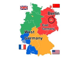 President Harry Truman became president in 1945 after Franklin D. Roosevelt's death. During his presidency, he authorized dropping atomic bombs on Hiroshima and Nagasaki, leading to Japan's surrender. The emergence of nuclear weapons and tensions with the Soviet Union marked the beginning of the Cold War. Truman pursued a policy of communist containment and established institutions like NATO and the Truman Doctrine to provide aid against Soviet expansionism. One crisis during this period was the Berlin Blockade by the Soviet Union in 1948, to which Truman responded by organizing the Berlin Airlift to supply West Berlin by air until the blockade ended.