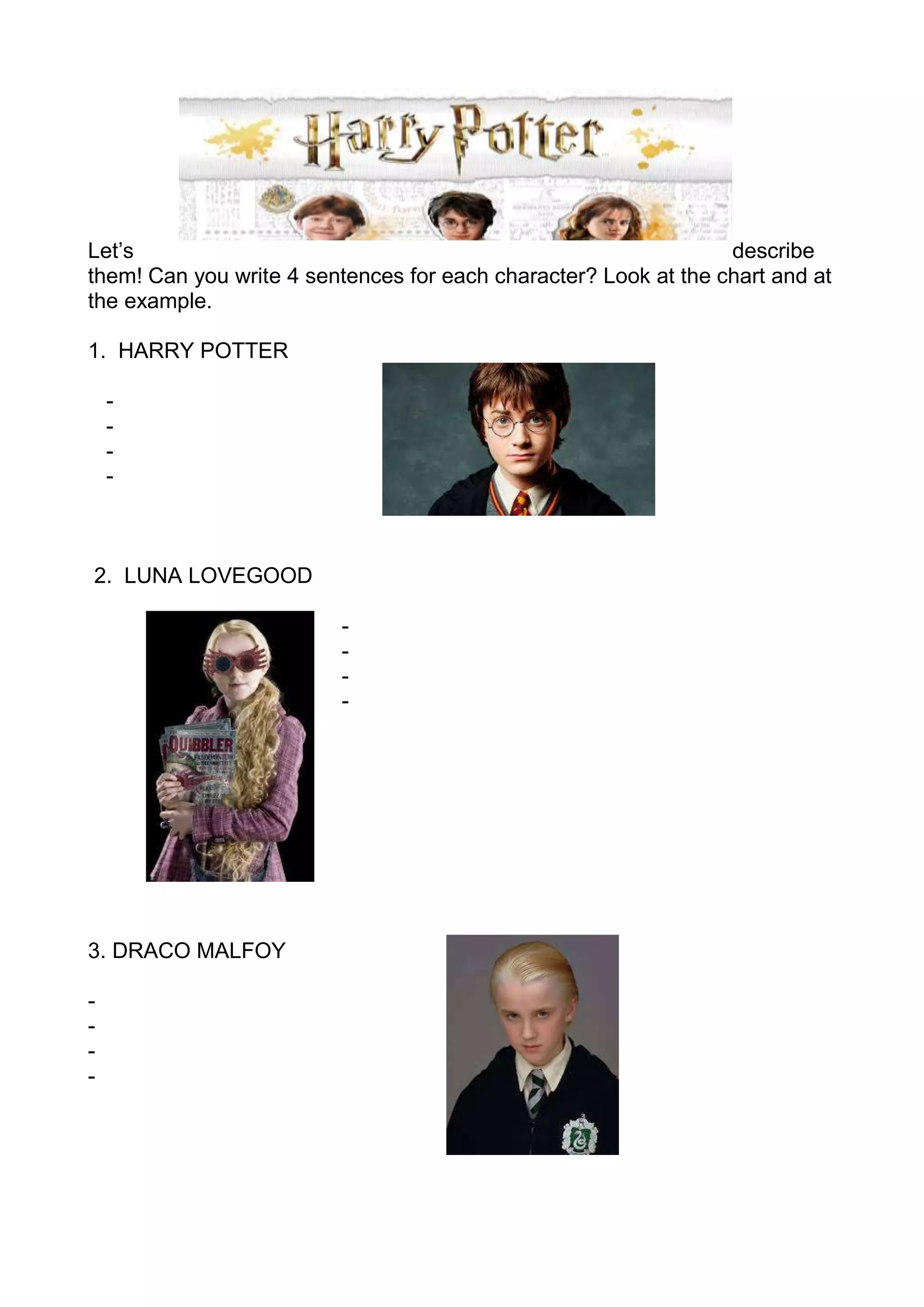 The document outlines instructions to describe four characters from the Harry Potter series. It emphasizes writing four sentences for each character, referencing specific physical traits like hair type, height, and facial features. An example is provided to illustrate the format of description, focusing on presence or absence of certain characteristics.