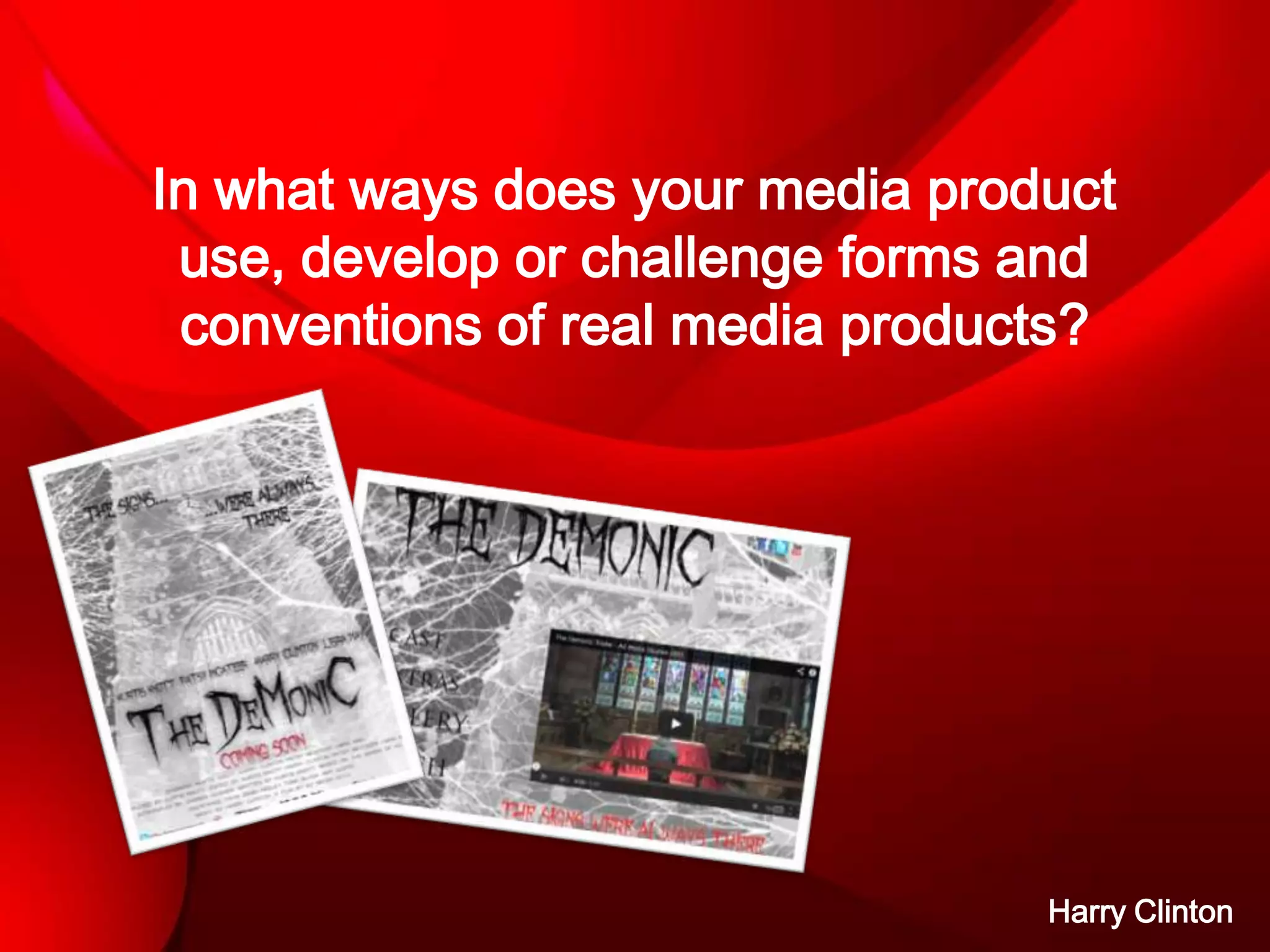 The document discusses the use and implementation of conventions in a media product, specifically focusing on a horror movie trailer, poster, and website. Key elements include the use of music to create tension, a significant church scene to contrast good and evil themes, and a distinct poster design emphasizing dark imagery with a bold, horror-themed font. Overall, the project aims to engage the audience through questions and suspense while adhering to traditional horror conventions.