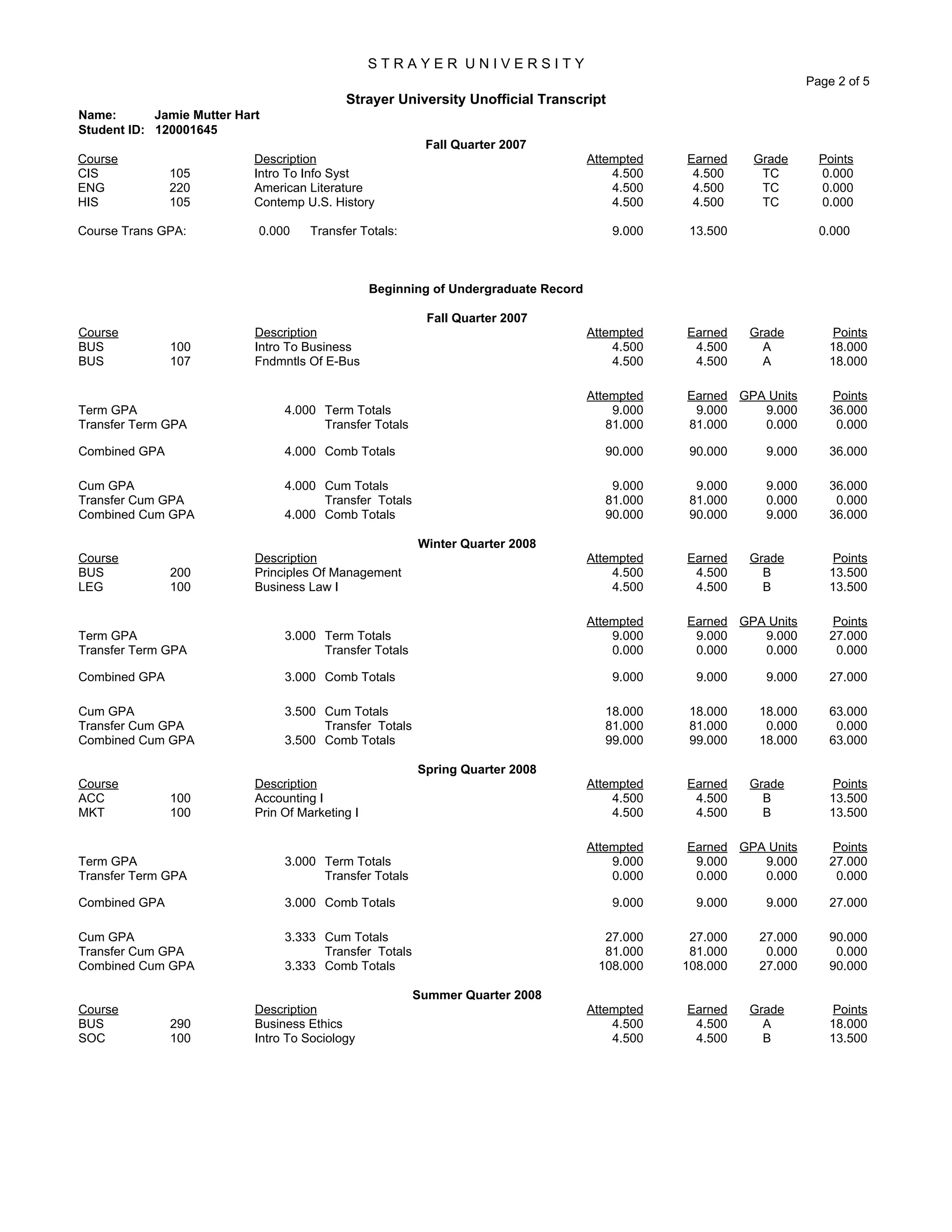 - The transcript details Jamie's undergraduate and graduate coursework and grades at Strayer University as well as transfer credits from two other colleges.