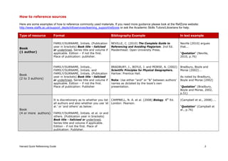 This document provides a quick guide to the Harvard referencing style. It explains that Harvard referencing requires citations in the text to direct the reader to the full references listed alphabetically in the reference list. The guide gives examples of how to reference various sources like books, journal articles, websites and more using the Harvard style of author surname and date. It emphasizes being consistent in capitalization, punctuation and formatting of references.