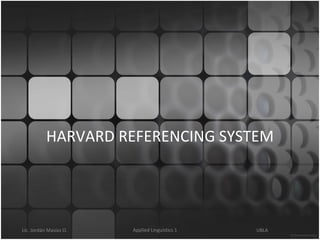 The document provides an overview of the Harvard referencing system for citing sources in academic writing. It explains that referencing involves acknowledging authors when quoting or using their ideas to avoid plagiarism. There are two types of references - in-text citations and a bibliography. In-text citations provide brief details of the source in parentheses, while the bibliography lists full details of all cited sources alphabetically at the end of the paper. The document gives examples of formatting references for different source types like books, journals, and websites.