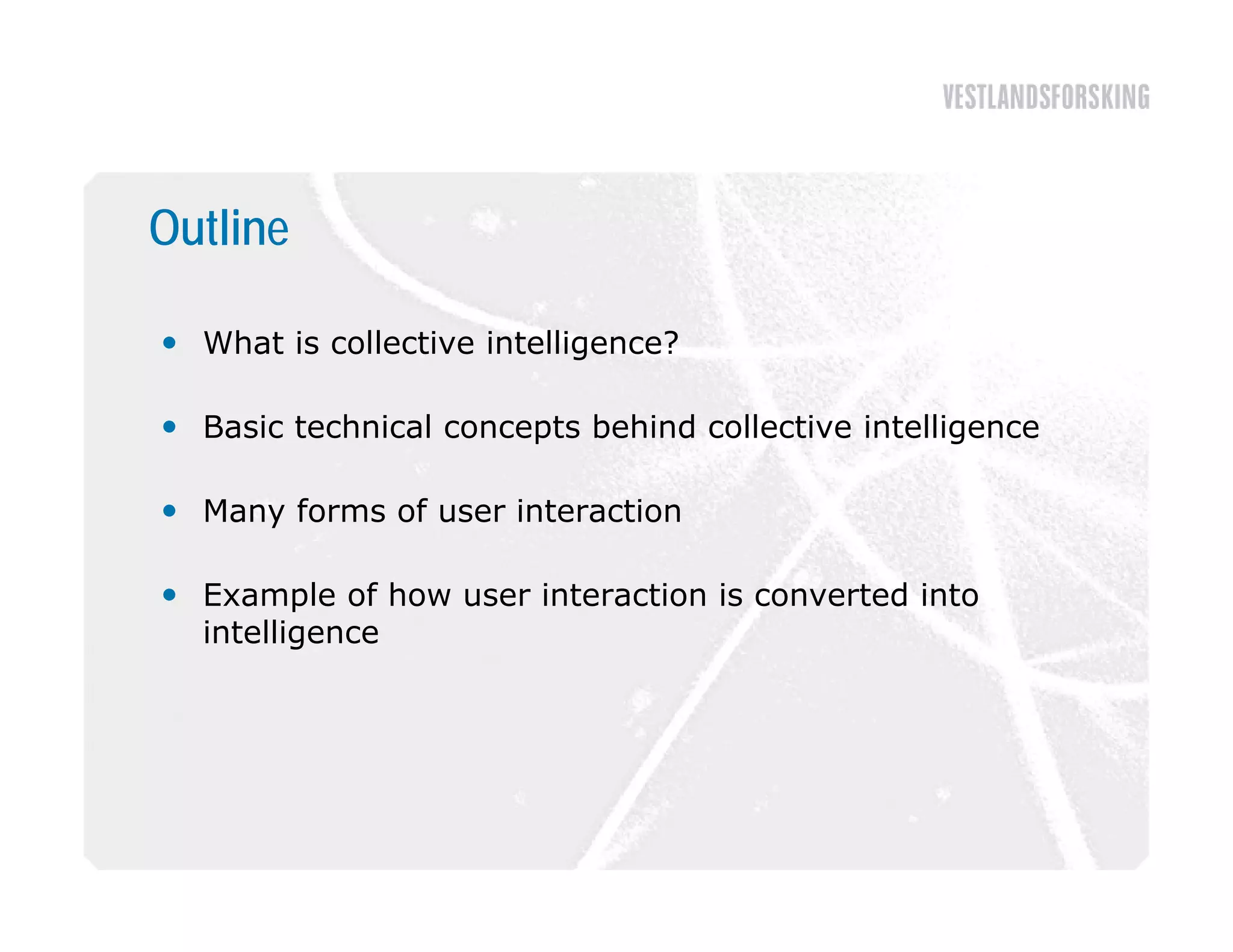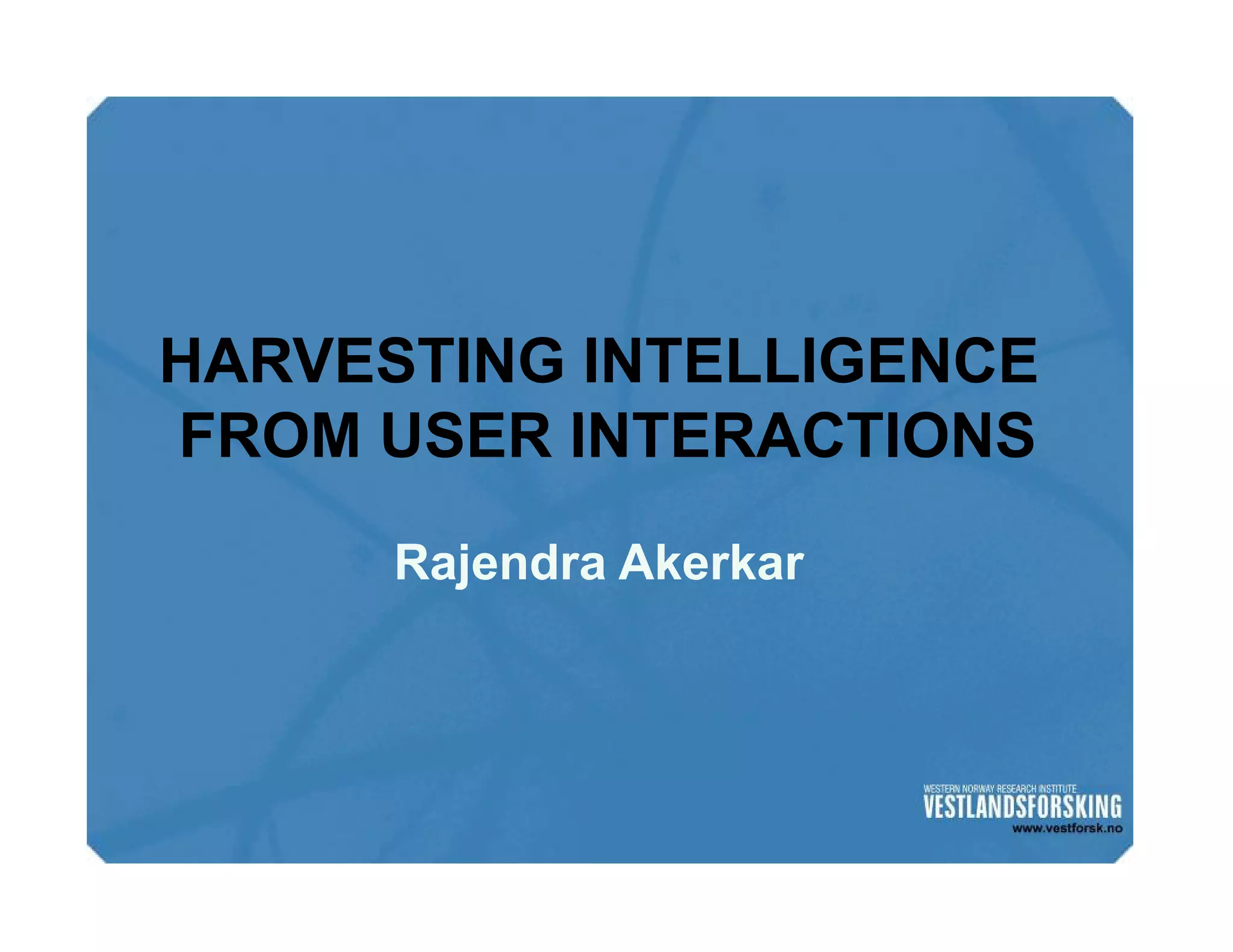 This document discusses how to harvest intelligence from user interactions on websites. It explains that as users share opinions, content, and participate in online communities, data is generated that can be converted into intelligence to personalize websites. It describes how collecting diverse opinions from many users can lead to "wise crowds" and collective intelligence. The key is to allow user interactions, learn about users in aggregate, and personalize content using this data. Content and collaborative filtering are approaches to build user and item profiles to detect meaningful relationships and make recommendations. The goal is to transform applications from being content-centric to being user-centric using collective intelligence.