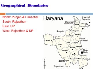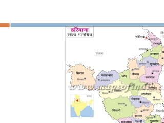 - There are 21 districts in the state including Gurgaon, Faridabad, Sonipat, and Ambala. Major crops include rice, wheat, and sugarcane.