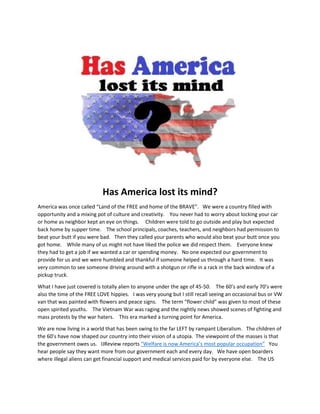The document laments the decline of America from a free, safe, and self-reliant society to one dominated by liberalism and government dependence. It argues that America has lost its way under progressive presidents like Obama and Carter who have weakened national security, expanded government, and undermined conservative values. The author calls on conservatives to take a stand against these trends in order to restore America's former greatness.
