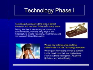 The document discusses the transformation of technology from addressing societal needs to a phase where advancements, like robotics and artificial intelligence, are being developed based on 'because we can' rather than 'because we need.' It raises concerns about the societal impacts of automating jobs and replacing human roles with machines, which could lead to reduced tax income and decreased consumer spending, affecting overall economic health. Furthermore, it emphasizes the need for responsible technology development that prioritizes improving societal welfare over mere technological capability.