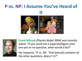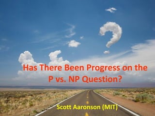 The document discusses the progress that has been made over 50 years in complexity theory research related to the P vs NP question. Some key achievements highlighted include increasing confidence that P vs NP is the right problem to focus on, gaining experience that suggests P is not equal to NP, understanding what a nontrivial lower bound might look like, establishing formal barriers to proving P vs NP, and making connections to real mathematics. The document argues that while a proof of P not equal to NP may require synthesizing many ideas, the field is not where it started and shouldn't give up hope of eventual progress.