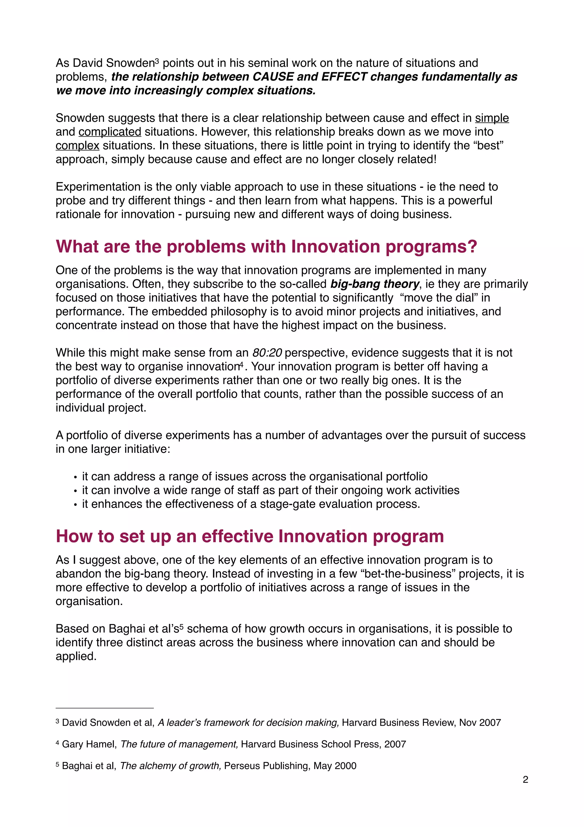 The document discusses the importance of effective innovation programs, highlighting that they should not rely on grand initiatives or 'snake oil' solutions but instead adopt a portfolio approach that includes diverse experiments and engages a broad range of staff. It critiques the common 'big-bang theory' of focusing solely on high-impact projects and emphasizes the need for a balanced mix of transformational, adjacent, and core innovations for sustained success and employee buy-in. Ultimately, it argues that cultivating an innovative culture requires ongoing leadership commitment and the establishment of an organizational ecology that supports experimentation and learning.