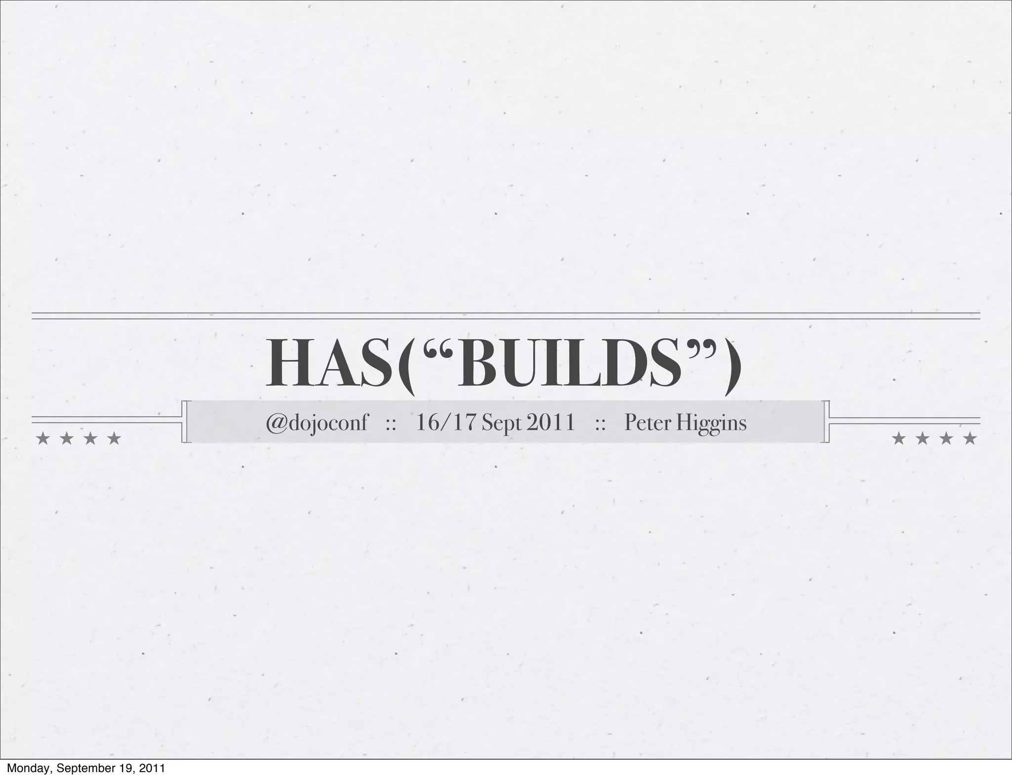 Peter Higgins is the Dojo Toolkit Project Lead. He gave a presentation on the history and use of the has() function in Dojo for feature detection. The has() function provides a way to write conditional code paths based on detected features. It has evolved from sniffing browsers to a more generic agnostic API. The Dojo builder uses the has() results to remove dead code paths and substitute variables.
