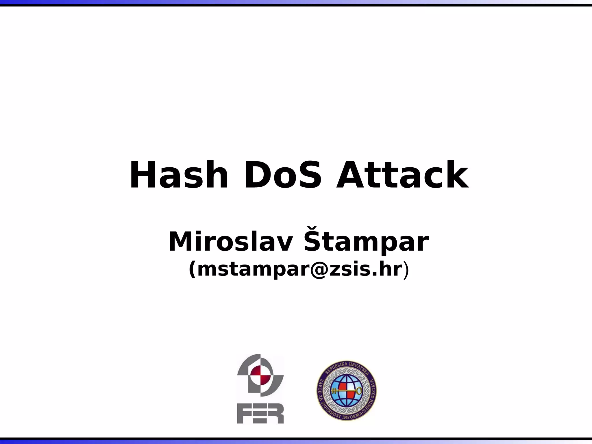The document outlines various types of Denial of Service (DoS) attacks, particularly focusing on hash DoS attacks that exploit hash table collisions. It details the mechanisms of these attacks, the affected software versions, and methods of mitigation. The content includes technical descriptions of hash algorithms and strategies for collision generation, alongside mitigation techniques to reduce vulnerability to such attacks.