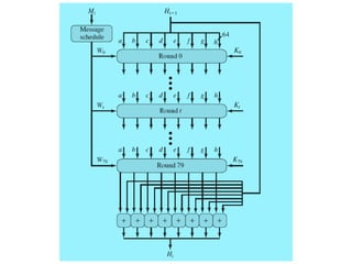 This document discusses cryptographic hash functions including their applications in message authentication and digital signatures. It describes the requirements for hash functions to be secure including resistance to brute force attacks and cryptanalysis. The document outlines some simple hash functions and provides details on the Secure Hash Algorithm (SHA) family of cryptographic hash functions used in standards like SHA-512 which operates on 1024-bit blocks through 80 rounds. It also mentions NIST's selection of the Keccak algorithm as the new SHA-3 standard.