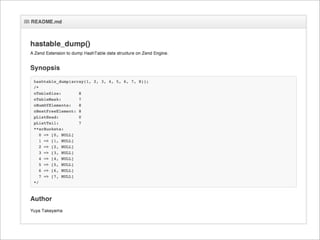 アルゴリズムとデータ構造編 第14章 ハッシュ探索①(チェイン法) http://www.geocities.jp/ky_webid/algorithm/014.html • PHPソースコードリーディング入門(とっかかり編) http://d.hatena.ne.jp/anatoo/20111031/1319991834 • Webアプリケーションに対する広範なDoS攻撃手法(hashdos)の影響と対策 http://blog.tokumaru.org/2011/12/webdoshashdos.html • Zend_Hash_Del_Key_Or_Index Vulnerability http://www.hardened-php.net/hphp/ zend_hash_del_key_or_index_vulnerability.html • ハッシュテーブルの実装 https://www.codeblog.org/blog/moriyoshi/20060824.html • PHP のコア: Zend Engine ハッカーの手引き http://www.php.net/manual/ja/internals2.php • PHP Extensions: Understanding and working with hash API Part 1 http://zendguru.wordpress.com/2009/05/10/php-extensions- understanding-and-working-with-hash-api-part-1/