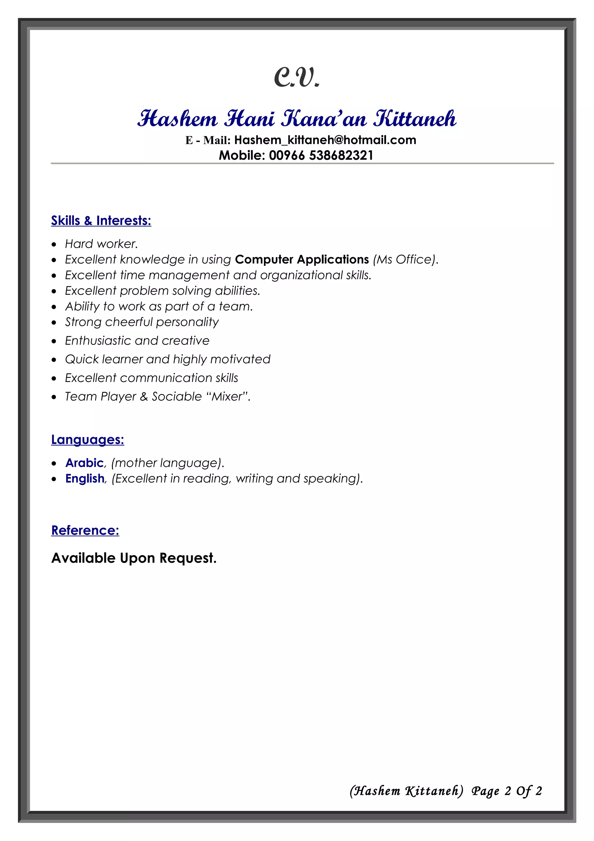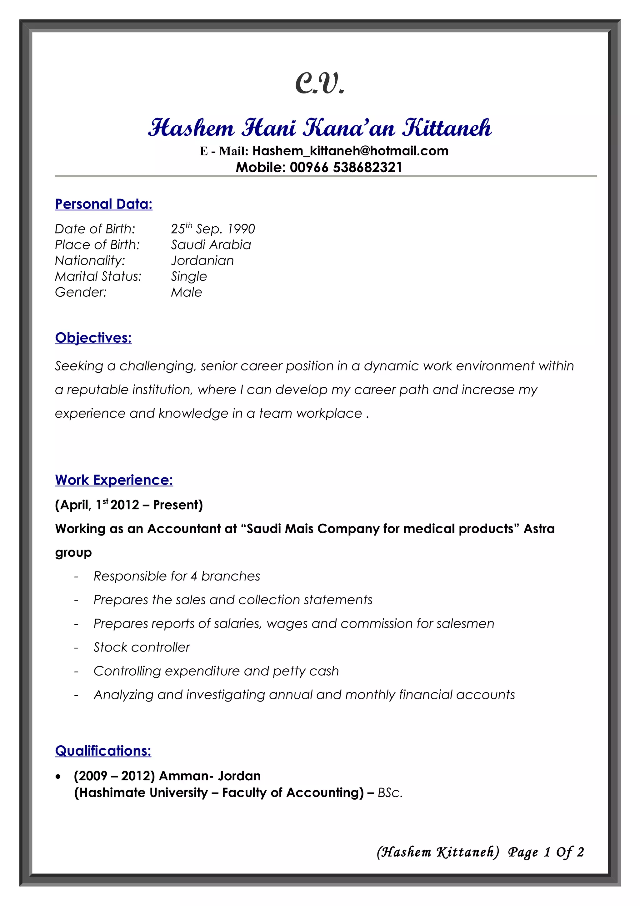 This CV summarizes the qualifications and experience of Hashem Hani Kana'an Kittaneh. He is currently working as an Accountant at Saudi Mais Company for medical products in Saudi Arabia, where he has worked since 2012. His responsibilities include overseeing 4 branches, preparing financial reports and statements, and controlling expenditures. He received a BSc in Accounting from Amman- Jordan's Hashimate University from 2009 to 2012. He is proficient in Arabic and English and has strong computer, communication, and organizational skills.