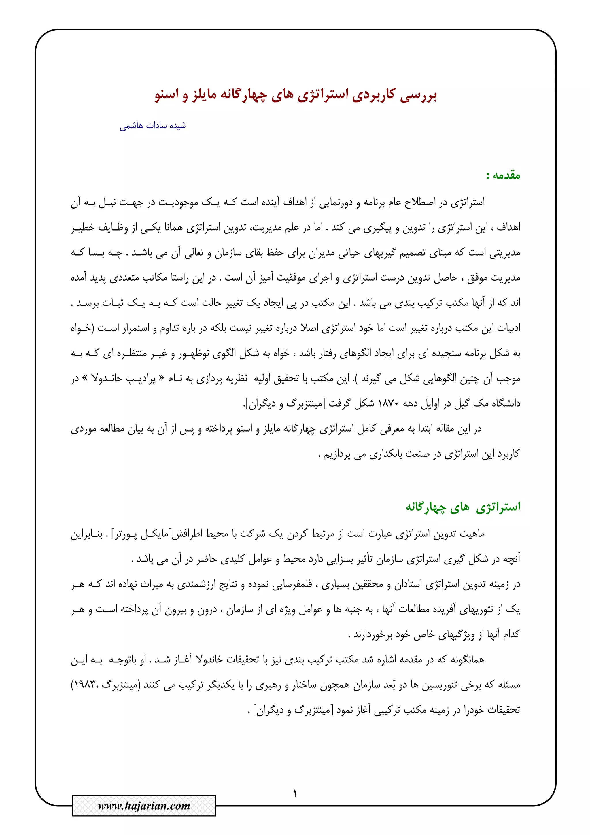 ﻣﻮردي ﻣﻄﺎﻟﻌﻪ ﺑﻴﺎن ﺑﻪ آن از ﭘﺲ و ﭘﺮداﺧﺘﻪ اﺳﻨﻮ و ﻣﺎﻳﻠﺰ ﭼﻬﺎرﮔﺎﻧﻪ اﺳﺘﺮاﺗﮋي ﻛﺎﻣﻞ ﻣﻌﺮﻓﻲ ﺑﻪ اﺑﺘﺪا ﻣﻘﺎﻟﻪ اﻳﻦ در