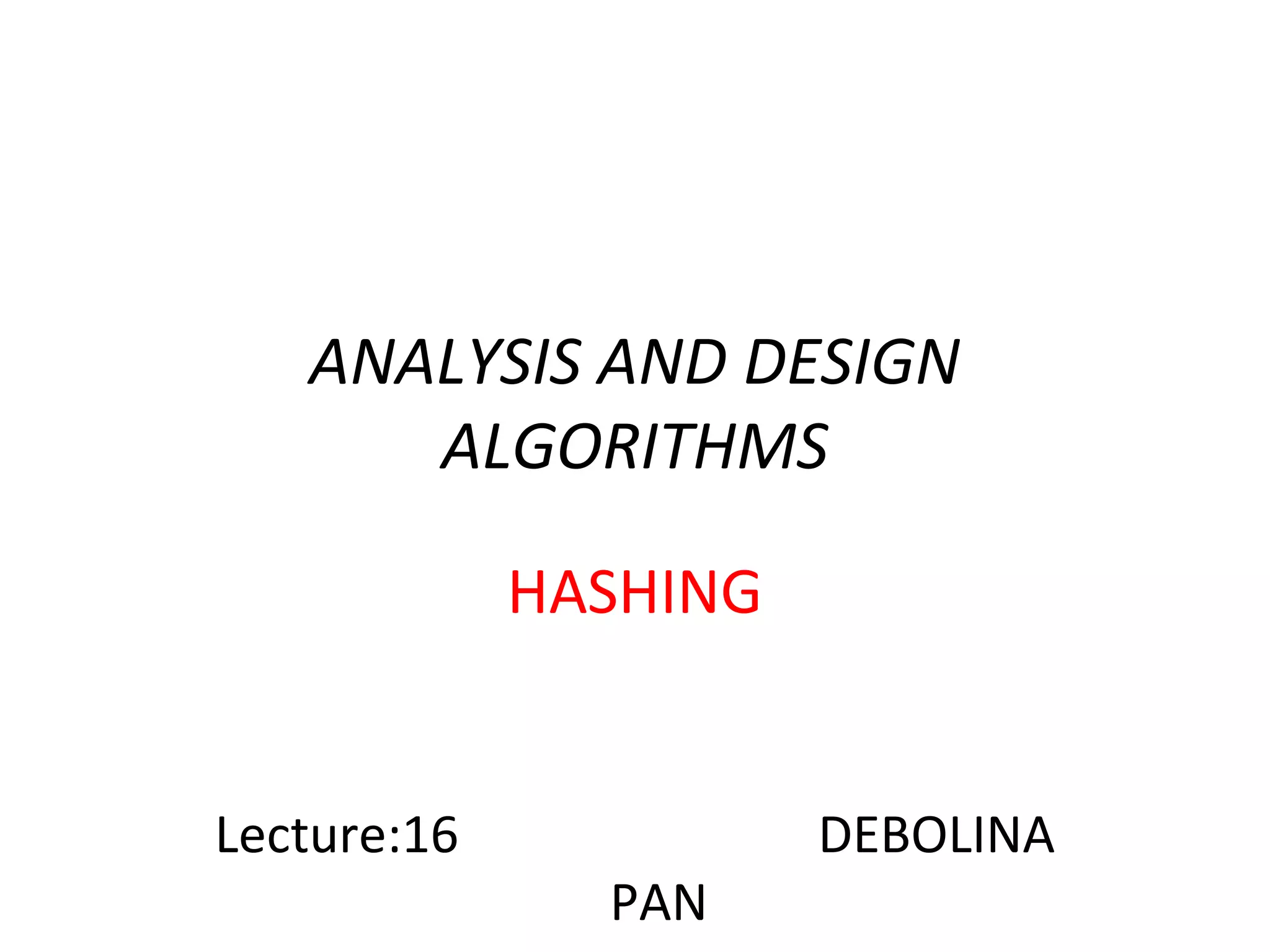 Hashing is a technique used to store and retrieve data efficiently. It involves using a hash function to map keys to integers that are used as indexes in an array. This improves searching time from O(n) to O(1) on average. However, collisions can occur when different keys map to the same index. Collision resolution techniques like chaining and open addressing are used to handle collisions. Chaining resolves collisions by linking keys together in buckets, while open addressing resolves them by probing to find the next empty index. Both approaches allow basic dictionary operations like insertion and search to be performed in O(1) average time when load factors are low.