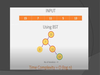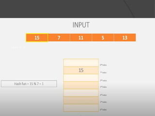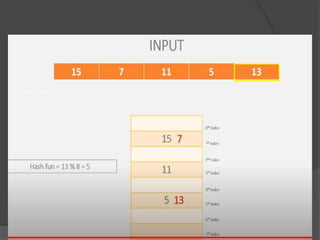 This document discusses hashing and separate chaining as a collision resolution technique for hashing. Hashing is a technique that maps data to array indexes using a hash function. Separate chaining handles collisions by linking each array index to a linked list, so multiple data items can be stored at each index. The document provides examples of calculating hash values for sample input data and inserting those values into a hash table using separate chaining to resolve collisions. Types of hashing and other collision resolution techniques are also briefly mentioned.