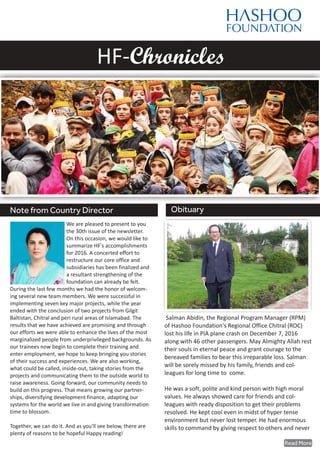 The document provides an update on Hashoo Foundation's (HF) accomplishments in 2016. A restructuring of HF's core office and subsidiaries was completed, strengthening the organization. Several new team members were welcomed. Seven major projects were successfully implemented and two projects concluded in Gilgit Baltistan, Chitral, and peri-urban Islamabad. The results achieved enhanced lives of underprivileged people. An obituary notes the passing of the Regional Program Manager of HF's Chitral office in a plane crash. Going forward, HF will continue growing partnerships and adapting systems to further progress.