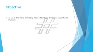 The document examines the trend of hosting contests on social media, primarily focusing on Twitter due to its high virality index. It outlines how contests are conducted using hashtags and includes rules for participation, while highlighting the benefits such as increased awareness and engagement, as well as potential drawbacks like attracting irrelevant followers. Overall, contests are viewed as effective tools for enhancing brand image and engaging target audiences.