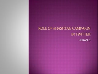 A hashtag is a word or phrase prefixed with a # symbol on Twitter. When used in a tweet, it links that tweet to others containing the same hashtag. Hashtags help index topics and keywords, and clicking on a hashtagged word in a tweet displays other tweets using that hashtag. They are used to make information more accessible and bring together conversations around certain topics or events on social media. Adding relevant hashtags to tweets can help increase engagement from others interested in that topic.