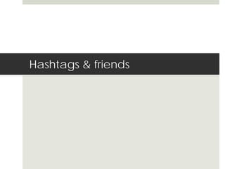 A hashtag is a metadata tag that groups messages on social media by prefixing a word or phrase with the '#' sign. The document details the history, technical specifications, and uses of hashtags, highlighting their impact on brand campaigns and social media interactions. Additionally, it provides an overview of Twitter and Instagram functionalities, including user accounts, notifications, and content sharing mechanisms.