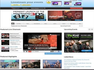 Livestream.com nedir?Livestream Webüzerinden canlı yapmak için kullanılan bir paylaşım sitesidir.Canlı olarak yayınları takip edebilir ya da kendi canlı yayın kanalımızı oluşturabiliriz.