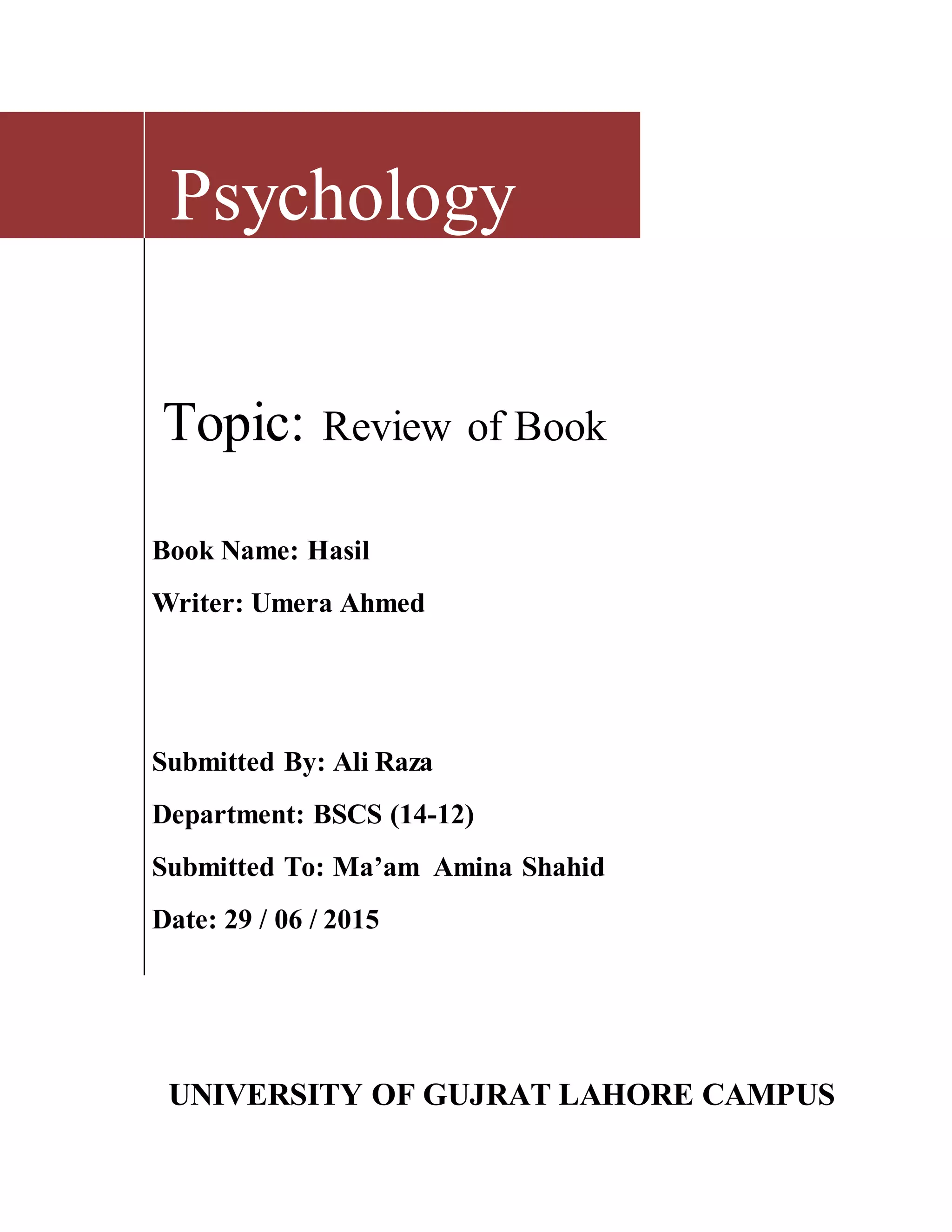Umera Ahmed's novel "Hasil" tells the story of Sania and Hadid, who come from different backgrounds and have opposing views of religion, but find meaning in their faith. The book highlights issues of life from different perspectives. Sania estranges from her family after insisting on marrying a Christian man, while Hadid loses his wealthy but dysfunctional family. They find solace in each other and rediscover the true meaning of their religion through overcoming crises together. The review praises the author's exploration of how people can forget their relationship with God during hard times but can also find peace and purpose through maintaining faith.