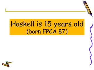 The document discusses the history and development of the Haskell programming language over 15 years. It summarizes key events like the initial meeting that kicked off Haskell in 1987, the release of the first Haskell report in 1990, and the standardization of Haskell 98. It also reflects on important aspects of Haskell like laziness, monads, and the process of language design by committee and community.