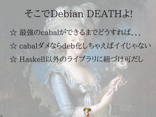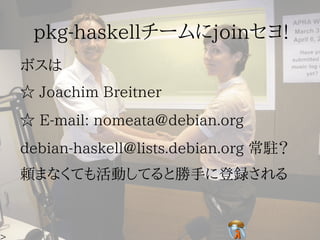This document provides instructions for contributing a new Haskell package to Debian. It describes initializing a Darcs repository for the package, generating the initial Debian packaging files, committing the package to the pkg-haskell Darcs repository, and building and uploading the package to Debian. Future updates are committed via Darcs and announced on the pkg-haskell mailing list.