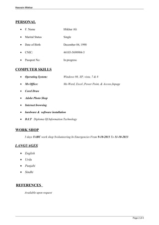 This document contains Hasnain Iftikhar's resume. It summarizes his objective to use his knowledge and experience to support an organization's goals. It also lists his 4 months of experience processing and preserving fruits and vegetables at the Sindh Horticulture Research Institute. Finally, it provides details of his education including a B.Sc. in Food Sciences and Technology from Sindh Agriculture University of Tando Jam.
