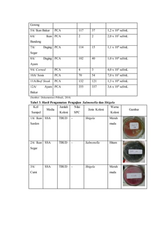 Dokumen ini menyajikan hasil pengamatan mikroorganisme pada daging, ayam, dan ikan dengan memuat berbagai tabel yang menunjukkan jumlah koloni dan nilai spesifik dari setiap sampel. Pengamatan mencakup jumlah koloni mikroorganisme serta analisis terhadap keberadaan salmonella dan shigela. Data diambil dari dokumentasi pribadi tahun 2014.