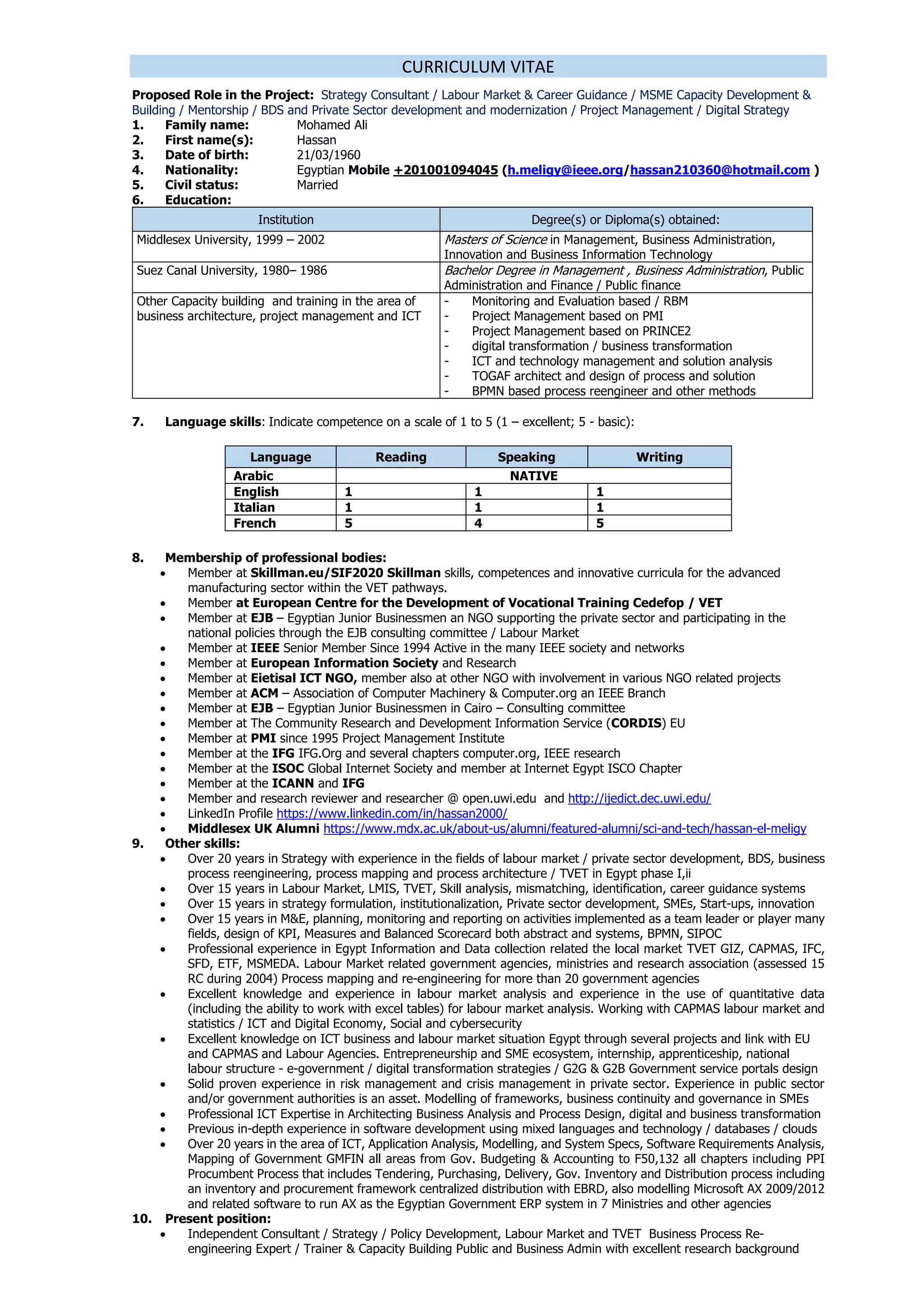 Hassan Ali has over 20 years of experience in strategy consulting, labour market analysis, career guidance, MSME capacity development, project management, and digital transformation. He has a Master's degree in Business Administration and has worked on numerous projects in Egypt, Italy, Jordan, Algeria, Switzerland, Saudi Arabia, Yemen, Iraq, and Lebanon focused on private sector development, business process reengineering, and developing TVET systems.