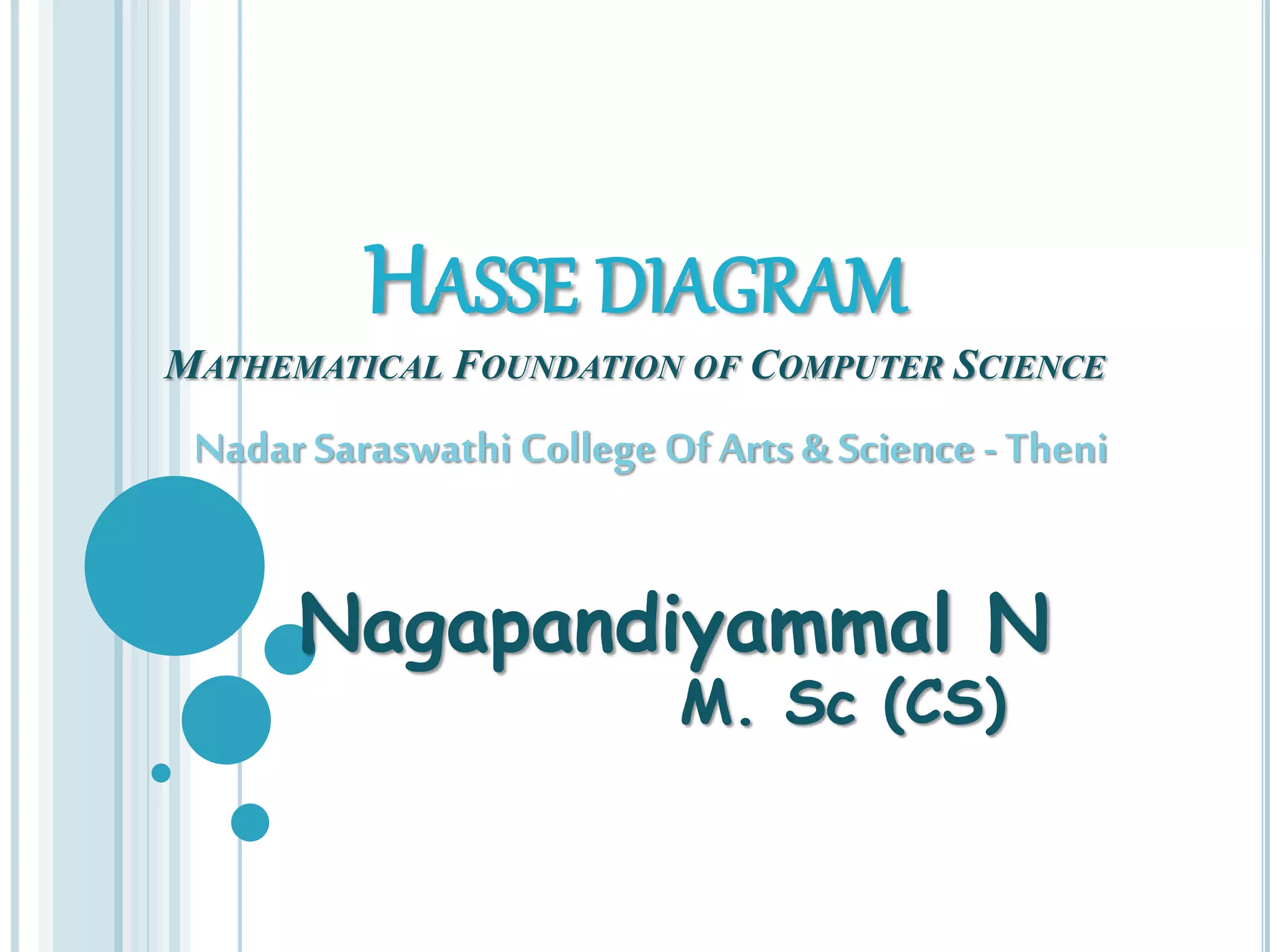 Hasse diagrams are a type of mathematical diagram used to represent finite partially ordered sets. They involve drawing the elements of the set as vertices, and connecting vertices with line segments when one element covers another based on the ordering. Hasse diagrams uniquely determine the partial order and provide an intuitive visualization compared to listing out the ordering relationships. Examples are given of Hasse diagrams for power sets ordered by set inclusion and integer sets ordered by the divides relation.