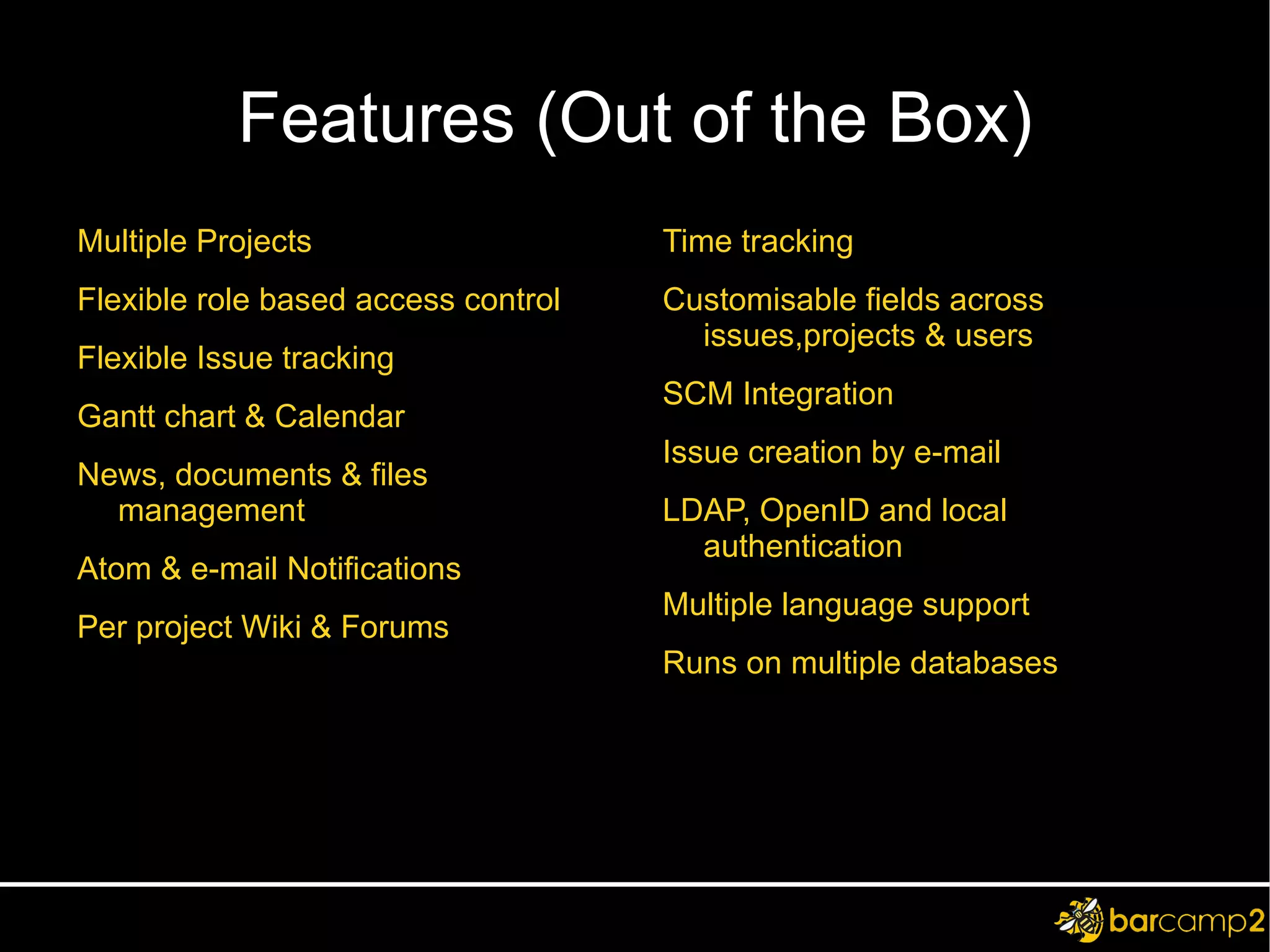 Redmine is an open source project management and issue tracking tool. It provides flexible issue tracking, wiki pages and documents, a Gantt chart and calendar, and notifications. Redmine can be customized with multiple plugins and themes and supports integration with source code management systems and migration from other tools. Installation involves creating a database, installing required gems, and generating a session key.