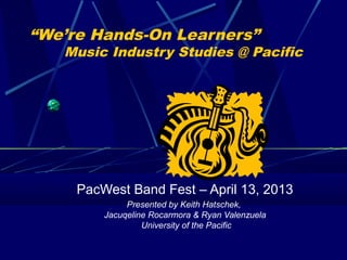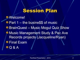 The document outlines a presentation about music industry studies at the University of the Pacific, including various aspects of music management, legal issues surrounding music ownership, and insights regarding earnings in the industry. It highlights the growing trend of indie artists retaining control over their work and achieving higher profits, as well as details of the music management curriculum offered at the university. The session also includes interactive quizzes and resources for further exploration of the music business.