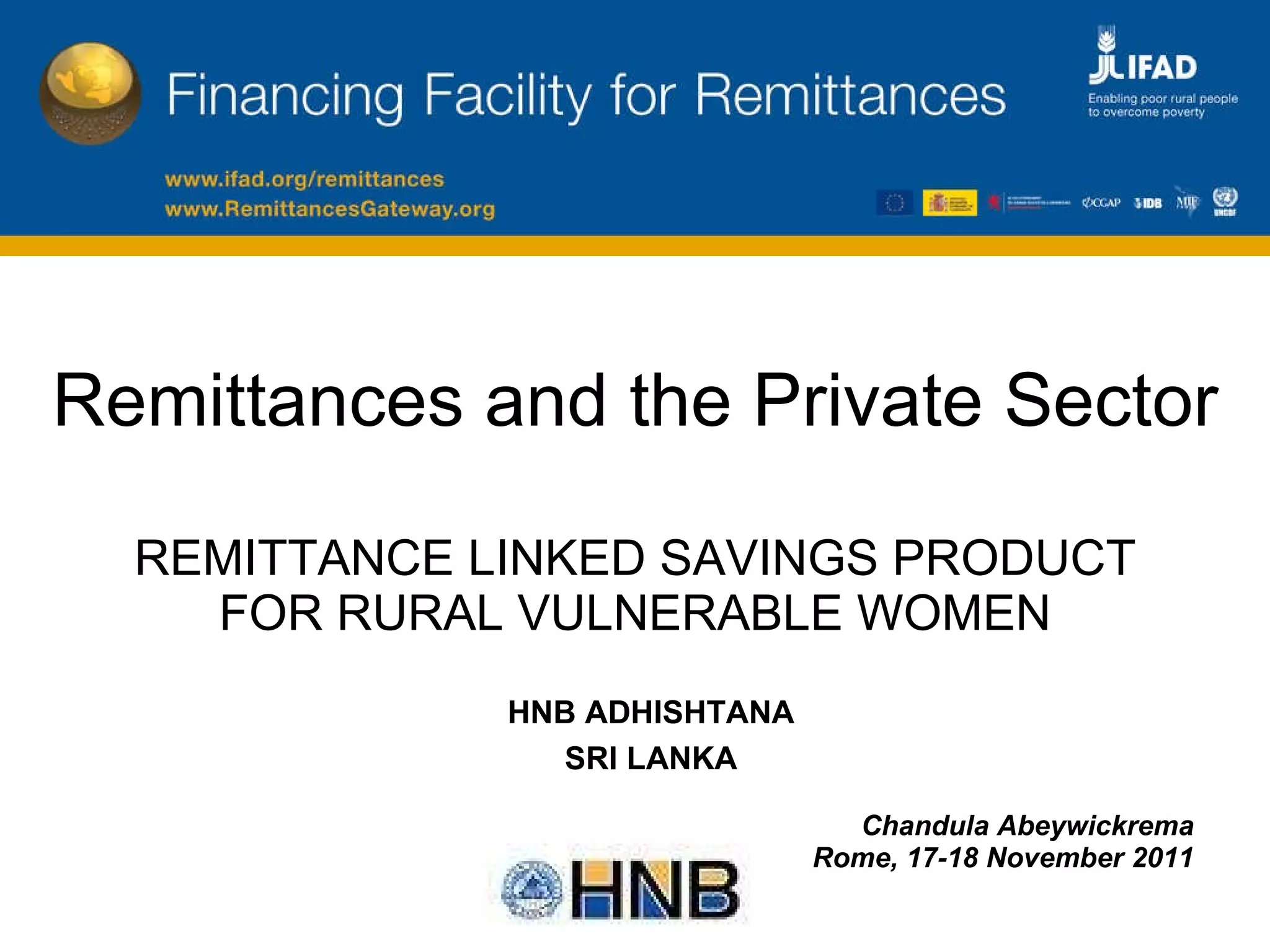 The document summarizes a remittance-linked savings product called HNB Adhishtana launched by HNB bank in Sri Lanka to empower rural vulnerable women receiving remittances. As of November 2011, the pilot program had 340 accounts with deposits of $135,500 across 4 branches. The program aims to promote financial inclusion, discipline savings, and support self-employment opportunities through financial literacy and access to loans. Key to the program's success is the public-private partnership with employment agencies and the Foreign Employment Bureau of Sri Lanka to promote awareness and cross-sell other banking products.