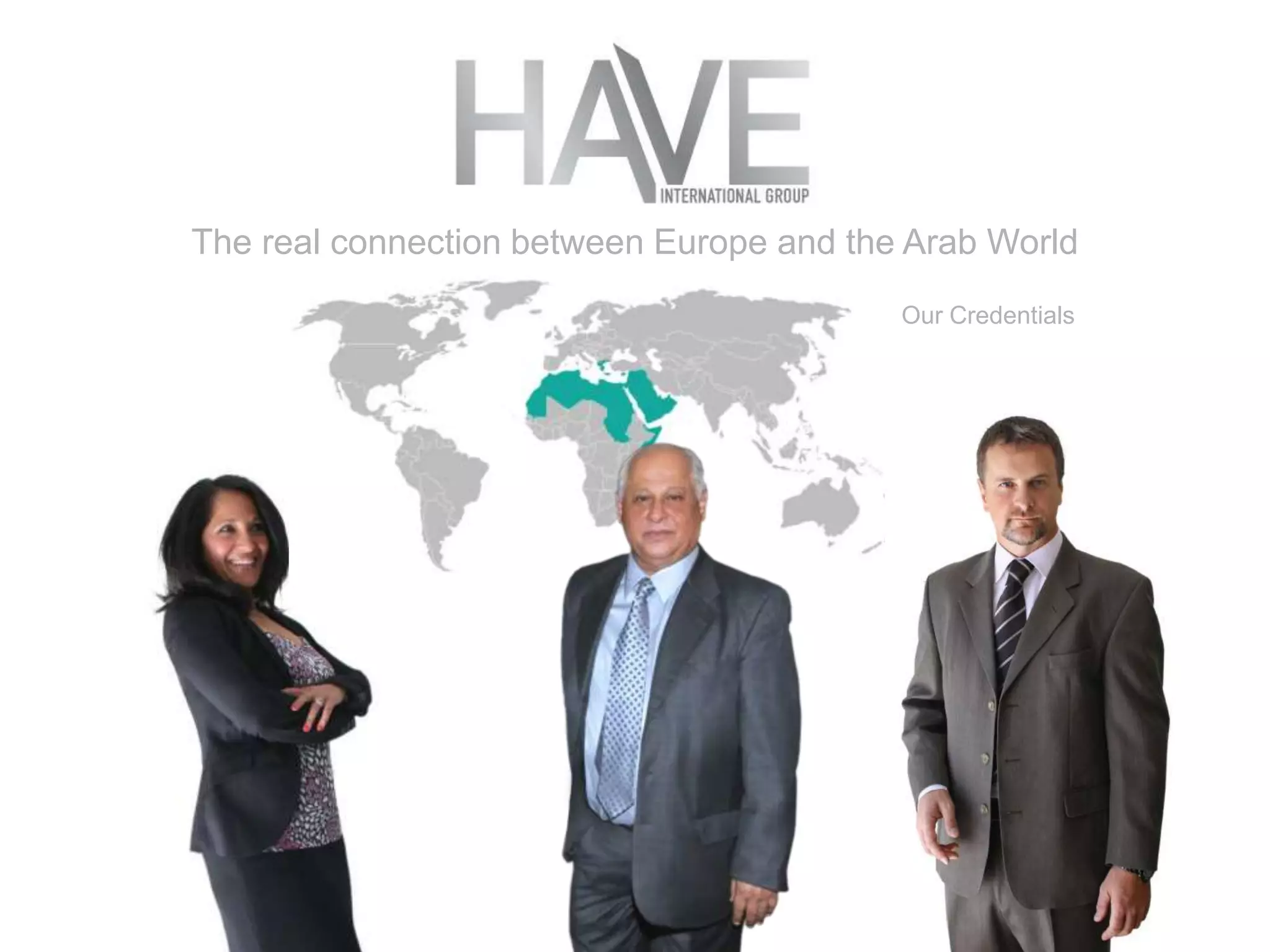 This document provides information about HAVE International Group, a consulting firm that offers public relations, communications, and business development services between Europe and the Arab World. It introduces the managing partners - Dr. Saleh S. Jallad, Adam Harcourt, and Maria Vestarki - and describes their extensive experience in business, government, media, and international relations. The document promotes HAVE International Group's network and abilities to help clients enhance business performance and facilitate connections with decision-makers across various industries and regions.
