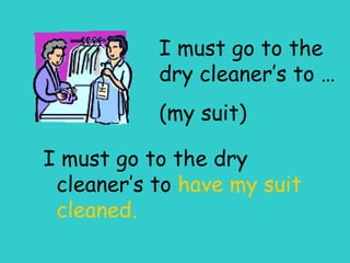 The causative form is used to indicate having an action done by another person or service, such as having clothing cleaned, hair cut, a house painted, or repairs made.