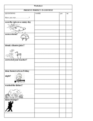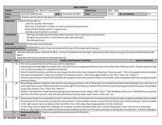 The document summarizes an English class for a group of 14 second year high school students. The class aims to have students talk about usual and unusual events they have experienced using the present perfect tense. Students will roleplay small talk, describe pictures, and interview classmates about experiences they have had using questions with "have/has ever". The class involves listening to a song, answering questions, and switching partners to interview each other.