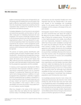 The document discusses an organization development approach to recruitment and selection, emphasizing the importance of establishing trust and shared expectations between candidates and companies. It highlights the LIFO (Life Orientations) method as a tool to evaluate behavioral compatibility, enhance communication, and build positive relationships within organizations. The article advocates for a recruitment process that is transparent and mutually beneficial, ultimately aiming to improve the integration of new employees into the organizational culture.