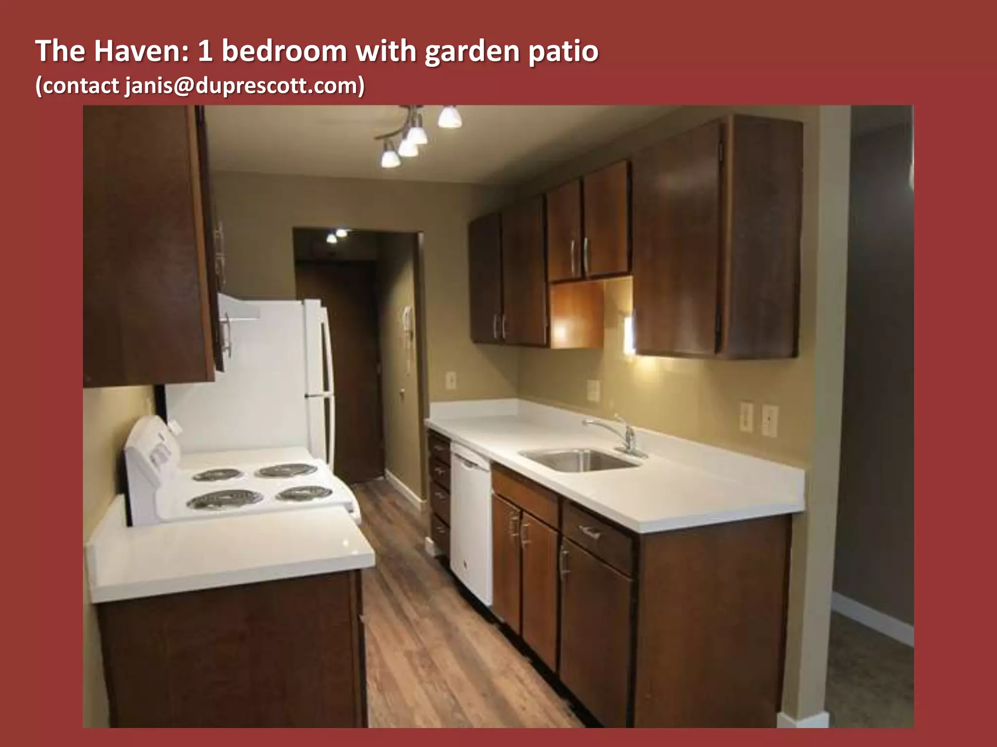 The document advertises a 1 bedroom property called The Haven that includes a garden patio and provides an email contact of janis@duprescott.com for 9 repetitions of the same listing information.
