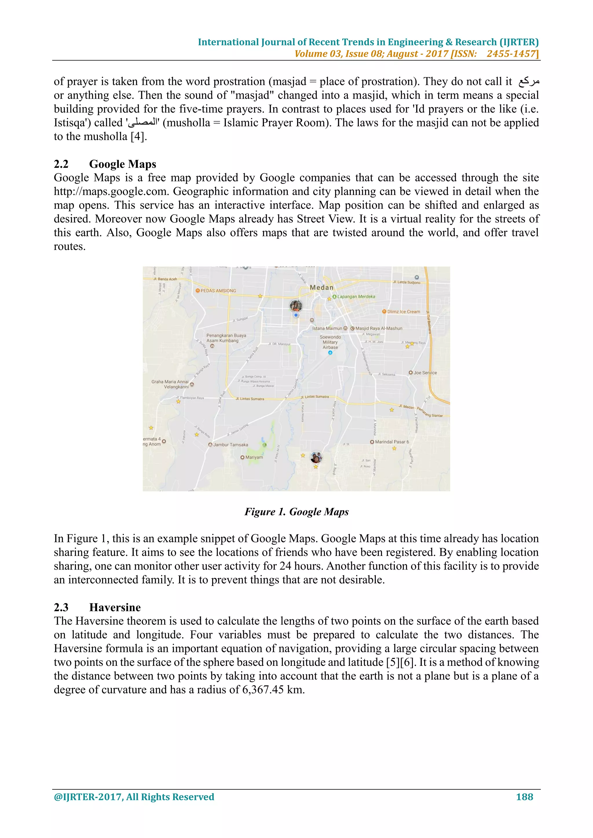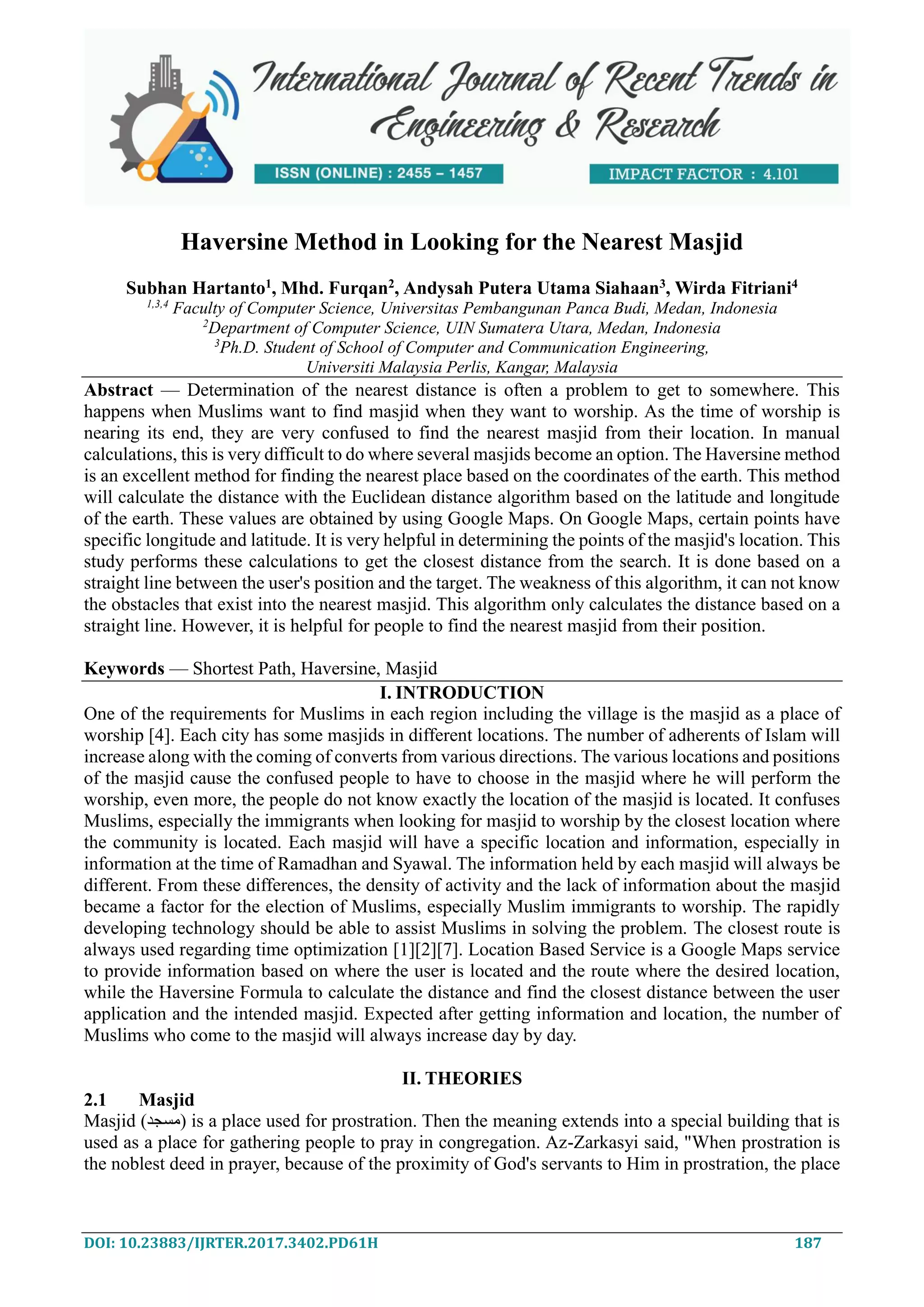 The document discusses the use of the haversine method to determine the nearest masjid for Muslims in Medan, Indonesia, when seeking a location for worship. By utilizing coordinates from Google Maps, the haversine formula calculates distances based on latitude and longitude, enabling users to find the closest masjid efficiently. However, the method does not account for obstacles on the route, which suggests the potential need for integration with a more comprehensive database of local conditions.