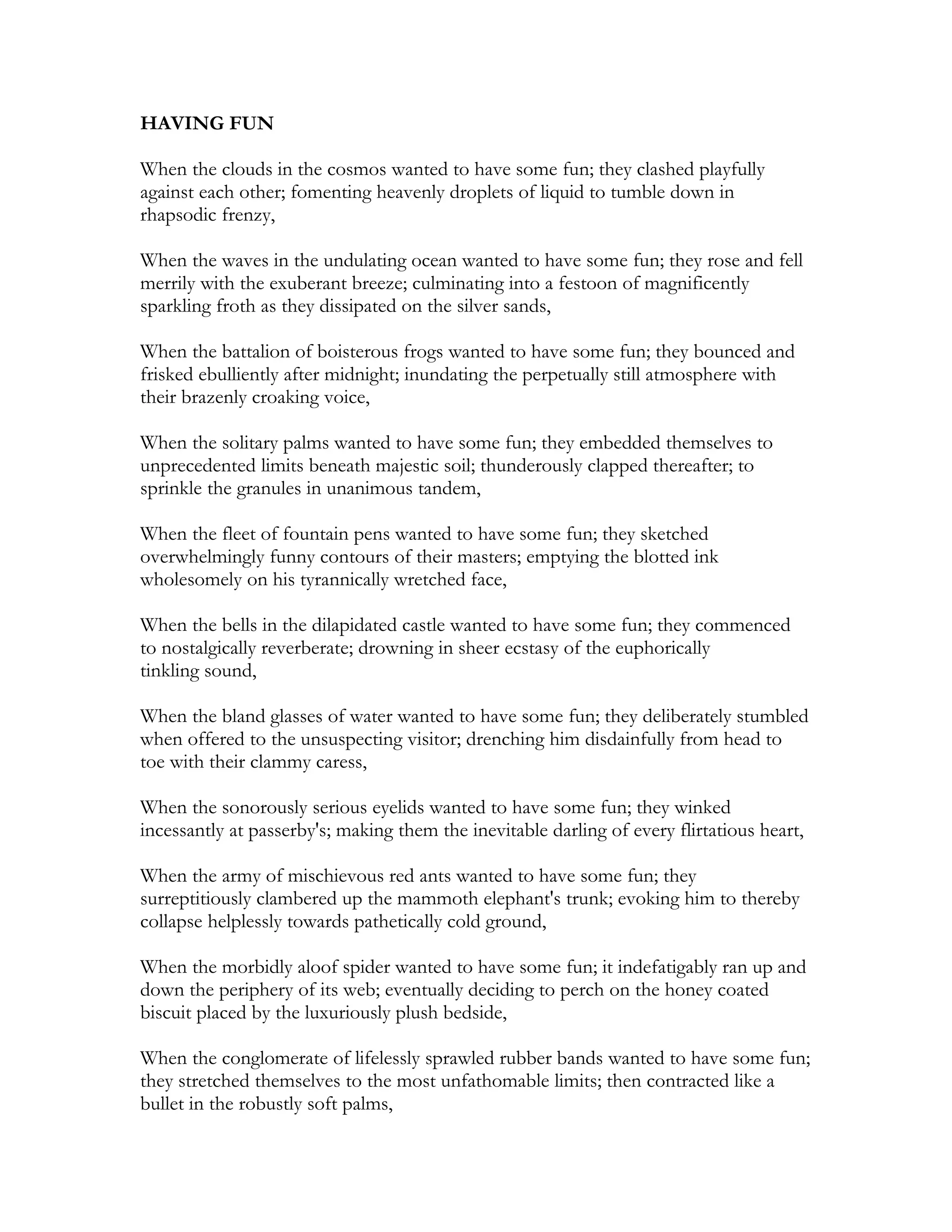 The document describes various objects and entities that want to have fun by playing tricks or pranks on others. These include clouds playing with each other, waves splashing in the ocean, frogs croaking at night, palm trees swaying and clapping, pens drawing funny pictures, bells ringing nostalgically, glasses of water spilling on people, eyelids winking, ants climbing on an elephant, a spider landing on a biscuit, rubber bands stretching and snapping back, a telephone ringing late at night, a tongue blurting nonsense, a razor shaving off a mustache, cricket balls breaking windows, mice eating money, birds defecating on a plate, a clock changing time, and finally a child playing with