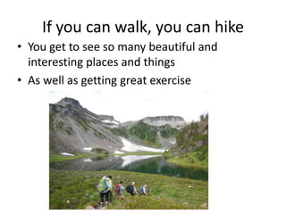 The document provides tips and safety information for hiking, including how to choose proper boots and packs, what to bring on day hikes and for backpacking, trail etiquette and safety protocols. It emphasizes the importance of being prepared for changing weather, staying hydrated, hiking in groups of at least three people and knowing basic first aid for injuries like hypothermia. The overall message is for hikers to practice safety while enjoying beautiful local trails.