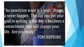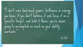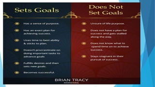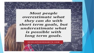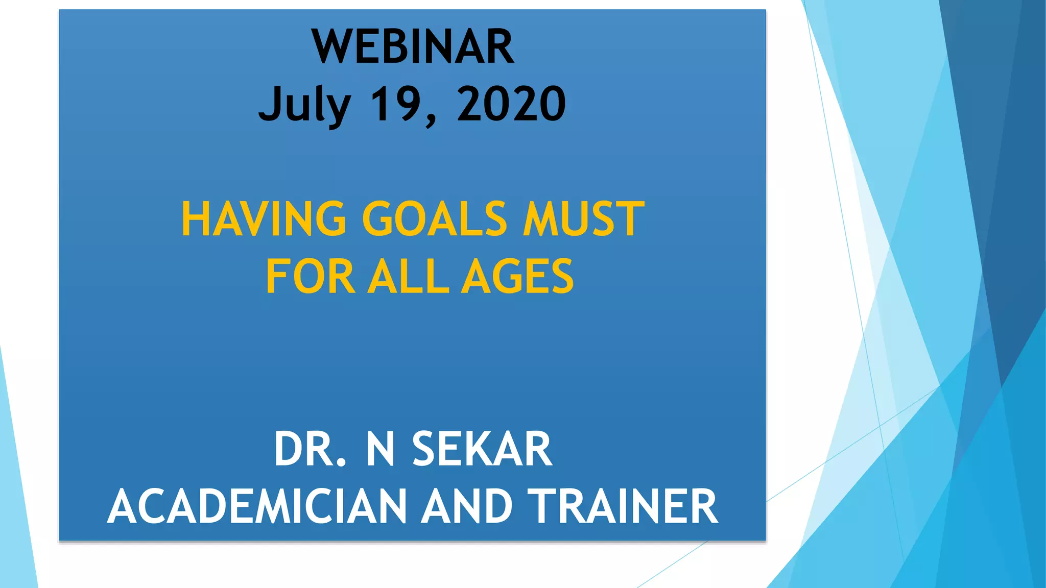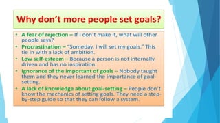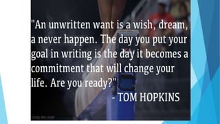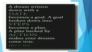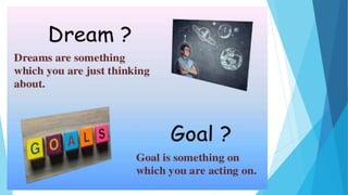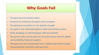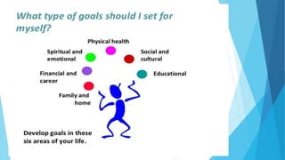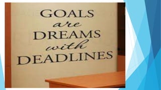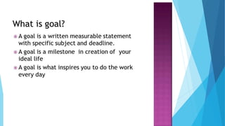 This webinar discusses the importance of goal setting for people of all ages. It is presented by Dr. N Sekar, an academician and trainer. Some signs that someone may be suffering from "goalless syndrome" are listed, such as oversleeping, drinking too much, and feeling bored. Various types of goals are then outlined, including career, financial, personal development, spiritual, educational, relationship, physical and health, and goals categorized by time (lifetime, long-term, short-term, stepping stone). The SMART framework for setting attainable goals is also explained. The webinar emphasizes that goal setting requires planning actions to achieve desired results and that making choices can change one's life.